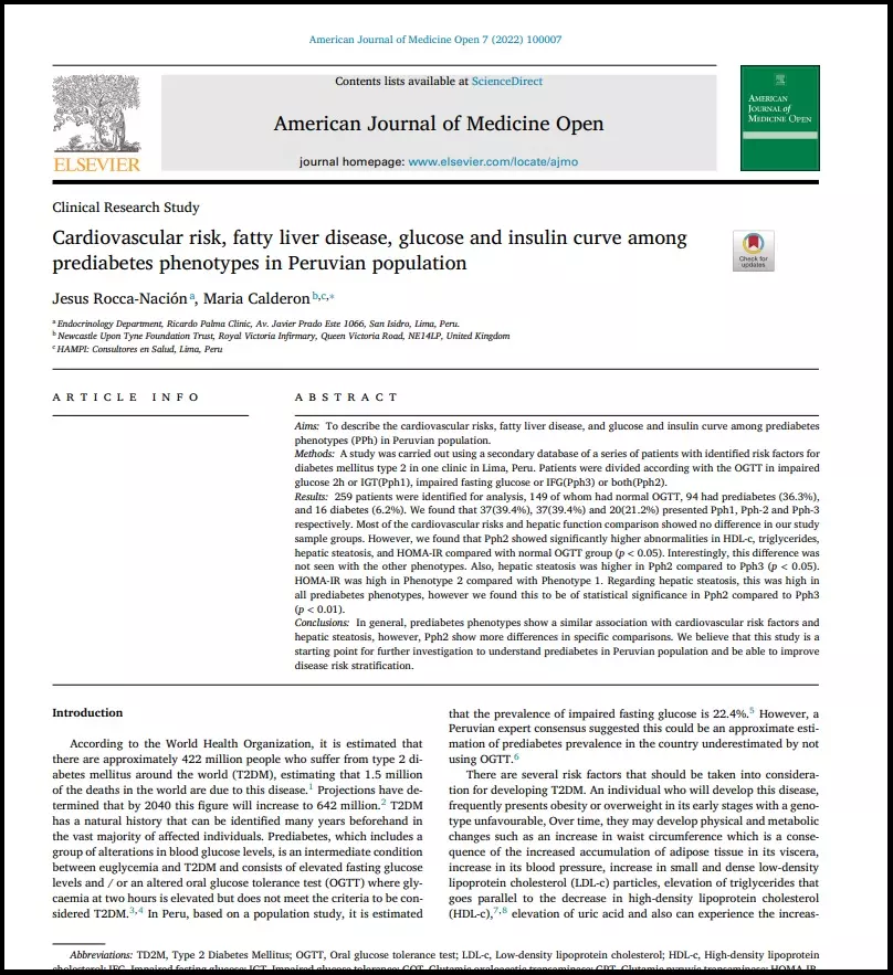 Una pregunta que nos hicimos fue si estos diversos fenotipos metabólicos tienen los mismos factores de riesgo cardiovascular. Para responder ello evaluamos una serie de casos de sujetos que tenían alto riesgo para diabetes (antecedentes familiares de diabetes de primer grado, índice de masa corporal mayor o igual a 27 y sujetos que tenían ya glucosas altas entre 100 a 125 mg/dl) y los sometimos a una prueba de tolerancia a la glucosa y a los sujetos con prediabetes comparamos sus niveles de lípidos, el índice Homa IR y la presencia de esteatosis hepática entre otros parámetros.